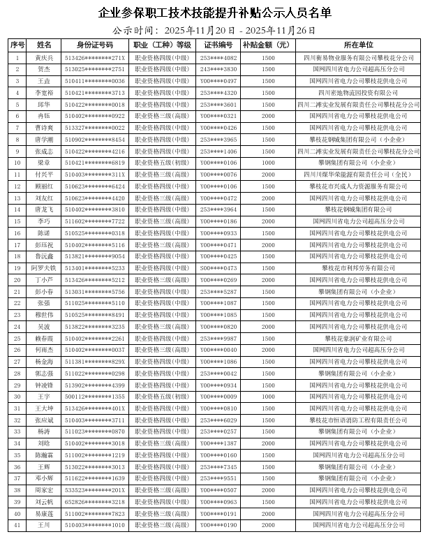 根据《攀枝花市人力资源和社会保障局攀枝花市财政局关于转发<四川省人力资源和社会保障厅四川省财政厅关于失业保险支持参保职工提升职业技能有关问题的通知>的通知》(攀人社发〔2017〕317号)文件规定,现将2025年11月符合失业保险技能提升补贴申请条件的人员(名单见附件)基本情况进行公示。