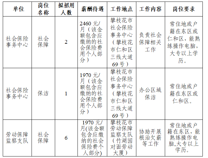 攀枝花市社会保险事务中心、攀枝花市劳动保障监察支队开发公益性岗位9个,拟安置被认定为就业困难人员的符合条件人员,相关岗位信息和安置人员要求如下。