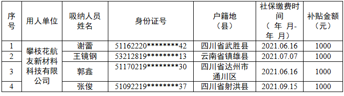 攀枝花市就业创业促进中心外地人员来攀就业奖补公示