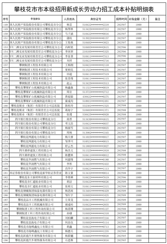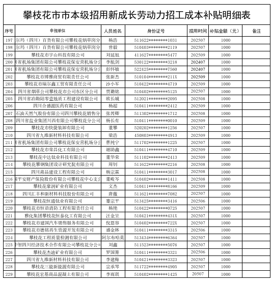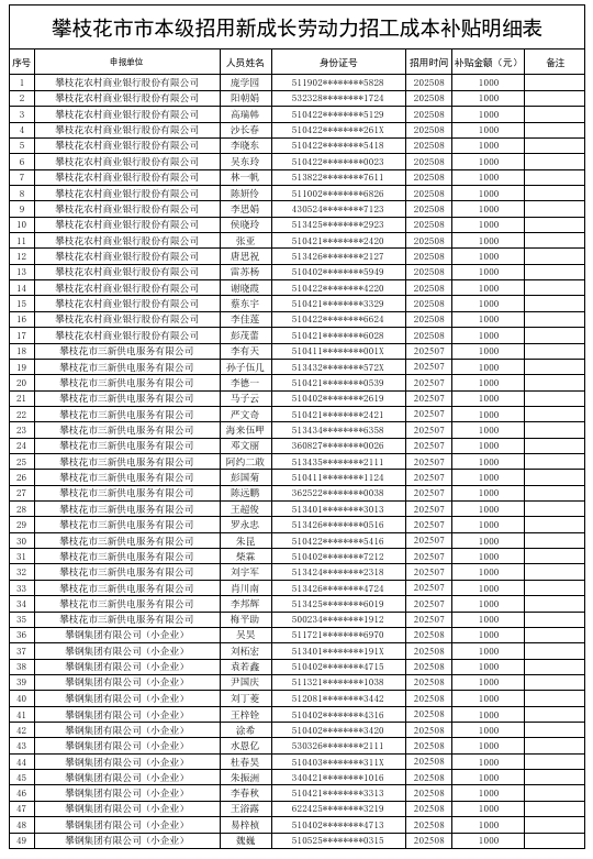 攀枝花市市本级企业招用新成长劳动力 招工成本补贴公示