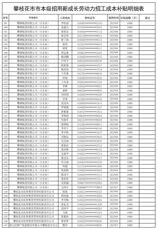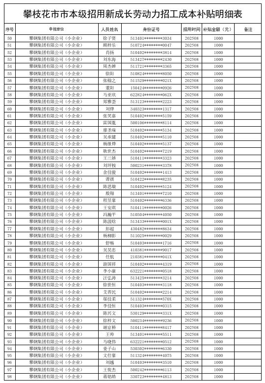 附件:攀枝花市市本级招用新成长劳动力招工成本补贴明细表